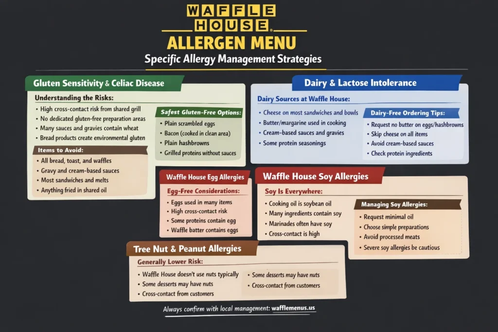 These items combine multiple allergen sources, making them particularly challenging. Explore options on our Waffle House Breakfast Menu and Waffle House Lunch and Dinner Menu.